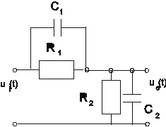 Circuitul RC din figura 1.9 reprezint_ un atenuator RC, a c_rei tensiune de ie_ire depinde de m_rimile componentelor din circuit. Pentru a ob_ine un divizor rezistiv _i deci a elimina distorsiunile introduse de divizorul RC, se alege pentru condensatorul C1, montat în paralel cu rezistorul R1, o astfel de valoare pentru care este îndeplinit_ rela_ia: R1 C1 = R2 C2. În acest caz atenuarea tensiunii de intrare se face dup_ un raport rezistiv. Figura 1.10 reprezint_ r_spunsul atenuatorului RC func_ie de m_rimea condensatorului C1, atunci când la intrare se aplic_ un semnal treapt_.