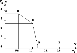 Dac_ tensiunea de intrare VI cre_te de la 0 V pân_ la VB, ie_irea por_ii se afl_ la poten_ial ridicat _i depinde relativ pu_in de sarcina circuitului. La cre_terea poten_ialului VI peste valoarea corespunz_toare punctului B, curentul de baz_ al tranzistorului Q1 este treptat transferat din emitor în colector, iar tranzistorul Q2 începe s_ conduc_ u_or. Amplificarea realizat_ pe por_iunea BC de tranzistorul Q2 este -R2/R3. Tranzistorul Q3 func_ioneaz_ ca repetor pe emitor, iar Q4 este blocat. Pentru valori VI>V0, tranzistorul Q4 începând s_ conduc_ determin_ o varia_ie mai rapid_ a tensiunii de ie_ire cu tensiunea de intrare (por_iunea CD). Aceast_ varia_ie rapid_ a lui V0 prin intrarea în conduc_ie a tranzistorului Q4 se datoreaz_ atât sc_derii poten_ialului colectorului acestuia cât _i reducerii impedan_ei de emitor a tranzistorului Q2 care duce la cre_terea amplific_rii sale. Tranzistoarele Q2, Q3 _i Q4 conduc în regiunea activ_ normal_, ceea ce duce la închiderea unei bucle de reac_ie pozitiv_ (colectorul lui Q2-baza lui Q3-dioda D3-colectorul lui Q4 _i emitorul lui Q2) _i dac_ frontul impulsurilor aplicate pe intrarea por_ii este mare (>100ns), la ie_ire apar oscila_ii de înalt_ frecven__. Pe de alt_ parte, pe aceast_ por_iune a caracteristicii de transfer (~1.5 V pentru VI) cre_te consumul de la sursa de alimentare, curentul absorbit de etajul final fiind limitat doar de rezisten_a R4. Ca efect al acestui fenomen sunt vârfurile de tensiune pe liniile de alimentare, pentru înl_turarea c_rora se monteaz_ capacit__i de decuplare. Pentru tensiuni de intrare mai mari de 2V, prin blocarea lui Q3 _i saturarea lui Q4 tensiunea de ie_ire r_mâne practic constant_ _i egal_ cu VCEsat a tranzistorului Q4.