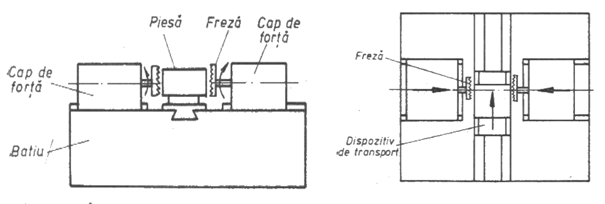 - masini-unelte agregat semiautomate, caracterizate prin existenta mai multor posturi de lucru si prin dispozitivul mobil de prindere al semifabricatului; in fiecare post de lucru se executa alte operatii, semifabricatul impreuna cu dispozitivul in care este fixat, trecand prin dreptul fiecarui post de lucru (fig.1,d,e).