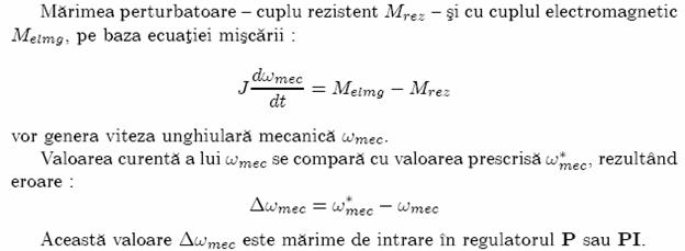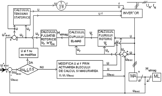 Se foloseste schema din figura urmatoare pentru reglarea turatiei la MA. Marimea prescrisa este ωmec−pulsatia mecanica rotorica (respectiv turatia rotorului n ωmec = 2πn). Prin traductorul de turatie se cunoaste ωmec (respectiv turatia momentana) si prin compararea cu ωmec se calculeaza tensiunea si frecventa, conform schemei de reglare.