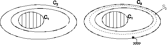 Intre coeficientii C11 si C12 se poate stabili o legatura simpla, tinand seama de influenta totala si analizand situatia particulara in care conductorul C2 este legat la pamant. In aceste conditii potentialul V2 al conductorului C2 este nul si suprafata exterioara a armaturii nu poarta sarcina electrica. Aplicand teorema Gauss pe suprafata S2 situata in interiorul lui C2 si tinand seama ca in orice punct al lui S2 campul electric este nul, se obtine: