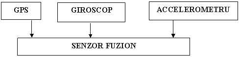 În figura 6 se prezinta cea de-a treia configuratie în care se utilizeaza un accelerometru pentru determinarea acceleratiei care în faza urmatoare este utilizata pentru determinarea vitezei relative si a distantei. Giroscopul ofera informatia pentru determinarea directiei de miscare. Modelul dinamic pentru configuratia data este: