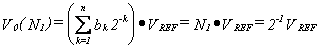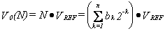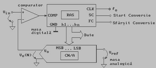 - se compara tensiunea de intrare VIN (care se doreste a fi convertita într-un numar binar), cu cea furnizata de CN/A (Convertor Numeric/Analogic) la un moment dat. Tensiunea furnizata de CN/A este V0(N) si reprezinta o fractie din VREF conform formulei: