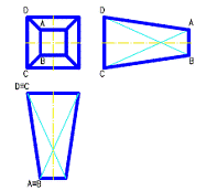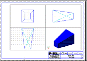 Sa se modeleze tridimensional un trunchi de piramida dreapta cu baza patrat, baza fiind situata în planul vertical. Dimensiunile sunt: latura bazei mari Sa se creeze în spatiul hârtiei, pe un layout adecvat, vederile ortogonale din fata, de sus si din stânga. |