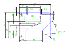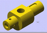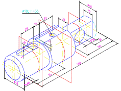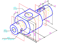 Sa se modeleze în spatiul tridimensional piesa din problema precedenta. Sa se genereze în spatiul hârtiei proiectiile 2D ale acesteia, la scara 2:1. Gaura filetata strapunsa se modeleaza la diametrul vârfului de filet (7.2 unitati) si nu la valoarea de 8 unitati. Filetul nu se modeleaza. |