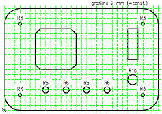 Sa se reprezinte în proiectiile ortogonale necesare si sa se coteze panoul din fata al unui aparat electric, panou redat în figura de mai jos. Sa se prezinte desenul pe un format standardizat din seria A, la o scara standardizata potrivit aleasa. Dimensiunile obiectului se determina de pe reteaua ortogonala pe care este desenat în figura de enunt a problemei. |