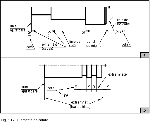 Principalele elemente de cotare sunt (fig. 6.12 : liniile ajutatoare, liniile de cota, extremitatile liniei de cota, punctul de origine, liniile de indicatie si valoarea numerica a cotei. Aceste elemente formeaza o singura entitate numita "cota" dar pot fi privite si ca niste entitati individuale care pot fi manevrate (editate) fiecare în parte. O cota ce a fost trasata cu o comanda de cotare se poate împarti în entitati daca se "explodeaza" folosind comanda EXPLODE.