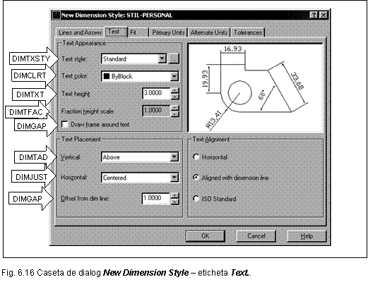 Text (fig. 6.16) ; permite controlul variabilelor de cotare legate de aspectul textului din cadrul cotelor, dupa cum este prezentat în tabelul 6.4.