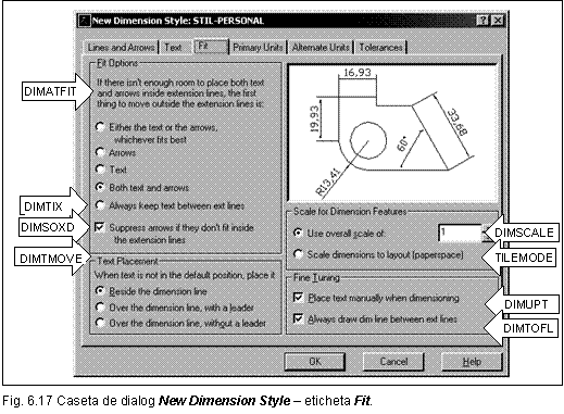 Fit (aranjaza, potriveste) (fig. 6.17) ; permite controlul variabilelor de cotare legate de asezarea textului cotei si a sagetilor, fie între liniile ajutatoare, fie în afara acestora, pe prelungirile liniei de cota, dupa cum este prezentat în tabelul 6.5.
