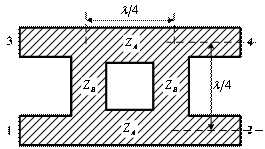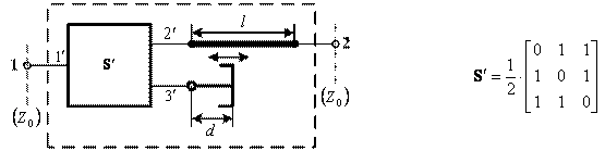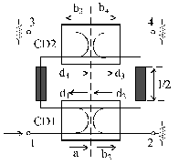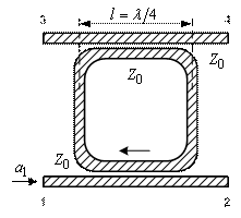 Analiza acestei structuri poate fi efectuata folosind modelul simplificat din Fig. 6. În acest model se admite ca portiunile inelului cuplate cu liniile alcatuiesc doua cuploare directive ideale. Cuploarele sunt contradirective, total adaptate, sunt de tip cuadratura si au o directivitate infinita la orice frecventa.