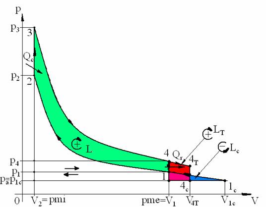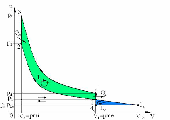 Daca notam πc = p1 / p1c , raportul de comprimare al compresorului, atunci, din lucrul mecanic util al motorului, se va scadea lucrul mecanic consumat de compresor.
