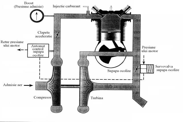 In cazul supraalimentarii cu grup turbo-compesor, o parte din energia gazelor evacuate este preluata de un etaj de turbina (de regula centripeta) si cu ajutorul unei clapete-supapa (clapeta by-pass) se aduce o parte din debitul gazelor evacuate in turbina. Turbina antreneaza un compresor (de regula centrifugal), a carui turatie de lucru (ce determina raportul de comprimare πc) este reglata de clapeta-supapa, ce limiteaza turatia grupului turbo-compresor la o valoare maxima, corespunzatoare unui raport de comprimare al aerului inainte de intrarea in motor, proiectat.