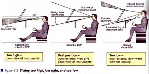 Pilotul trebuie sa stea pe scaun si sa aiba o pozitie a ochilor care, cu miscari mici ale capului, sa cuprinda: