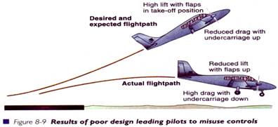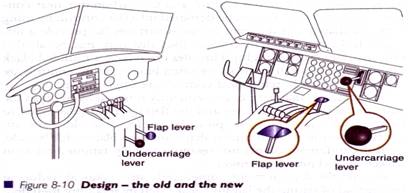 Doua comenzi, care, in trecut, au fost frecvent folosite gresit de piloti, sunt cele ale trenului de aterizare si ale flapsurilor - o eroare de "pilotaj" , dar indusa de un design defectuos. La unele tipuri de avioane mai vechi, cele doua comenzi erau de aceeasi forma si marime, amplasate una langa cealalta, avand culori diferite, dar care pareau sa nu fie de prea mare ajutor mai ales la zborurile de noapte, in cabine intunecoase, cu piloti obositi.