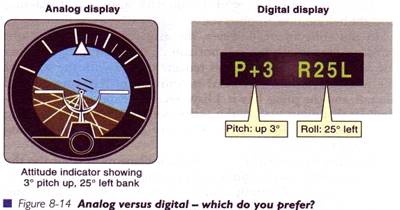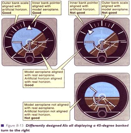 Cum aparatele raspund la comenzile date de pilot (sau autopilot), datele afisate depind si de designul acestor aparate, dar la aparatele care indica pozitia avionului, macheta acestuia este fixa si orizontul artificial se misca pentru a se alinia cu cel real.