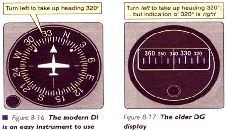 Indicatorul modern de directie ( ID), numit si indicator de cap ( IC ), sau girodirectional (GD), este plasat direct sub giroorizont, in desfasurarea "T"-ului de baza, este un aparat usor de interpretat si utilizat intuitiv. Este clar pentru marea majoritate a pilotilor, ca pentru a schimba capul de la 3600 la 3400 si apoi la 3200 este necesar un viraj spre stanga. Capul dorit este la stanga celui actual, atat in realitate cat si pe indicatorul de directie. ID se bazeaza pe un giroscop care isi mentine directia in spatiu (ideal, raportata la nordul magnetic) si care da cu acuratete capul magnetic in timpul virajelor si acceleratiilor. In contrast, in fig 8 - 17, vechiul ID, care nu era un aparat intuitiv.