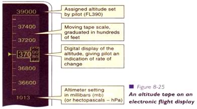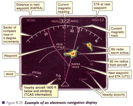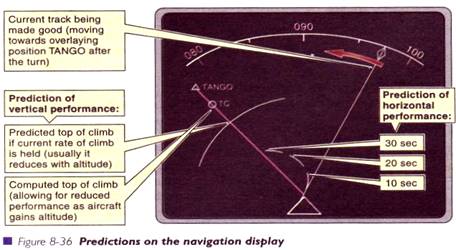 Pot fi afisate numeroase elemente utile, inclusiv aeroporturile din vecinatate, statiile VOR, ETA la punctele de verificare de pe ruta, radar meteo si TCAS, potentiale riscuri de coliziune. Anticiparea evolutiilor atat la orizontala (viraje), cat si pe verticala (urcare, coborare), este indicata in fig.8-36.
