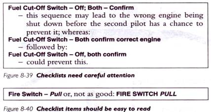 Checklist-urile trebuie scrise in asa fel incat fiecare element sa fie clar nu numai din punct de vedere al verificarii, dar si a raspunsului care trebuie dat. Verificarea si raspunsul la verificare sunt baza bunei conlucrari a membrilor unui echipaj in cabina. In cazul unor elemente esentiale, este necesar raspunsul ambilor piloti, uneori inainte de a actiona. Cele mai bune checklist-uri sunt concepute astfel incat, pentru elementele esentiale sa raspunda cei doi piloti inainte sa actioneze; altele sunt scrise intr-un mod care poate duce la unele confuzii - de aceea trebuie mare atentie cand operam cu checklist-urile. Exemplu: