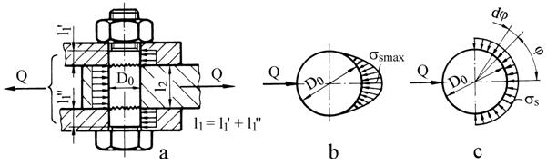 La aceste asamblari (fig. 2.38) se folosesc suruburi speciale (denumite suruburi de pasuire), cu tija nefiletata mai mare in diametru decat tija filetata si prelucrata mai precis. Sarcina transversala Q se transmite de la o tabla la alta prin contact intre acestea si tija nefiletata a surubului; aceasta este solicitata la forfecare - in planul de separatie dintre table - si la strivire - la contactul tija nefiletata - table.