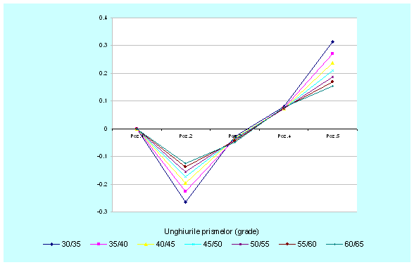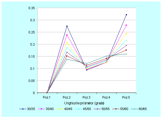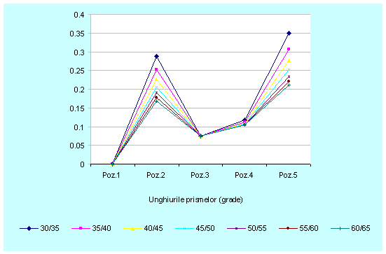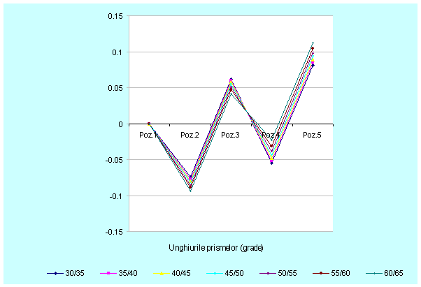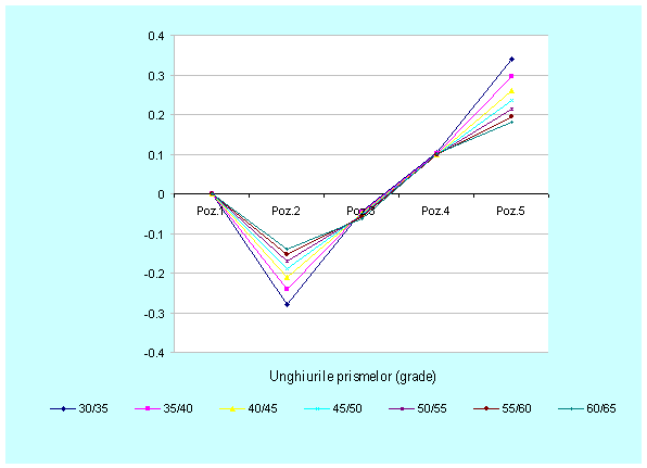 de referinta (pozitia 1), la orientarea fata de o prisma fixa, in functie de variatia unghiurilor prismelor.
