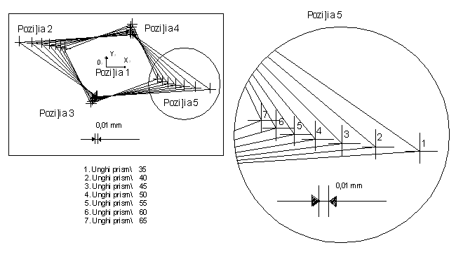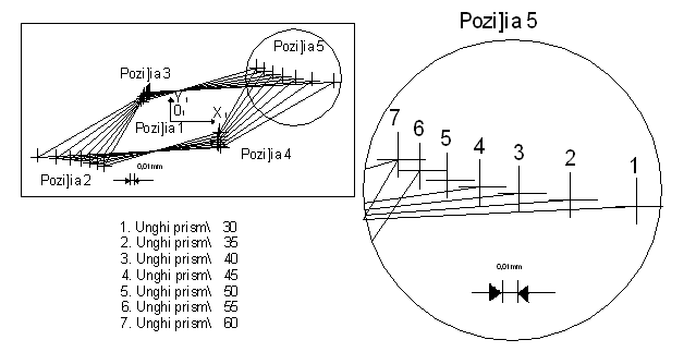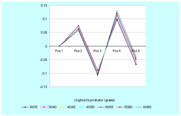 de referinta (pozitia 1), la orientarea fata de o prisma fixa, in functie de variatia unghiurilor prismei.