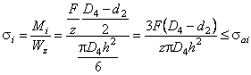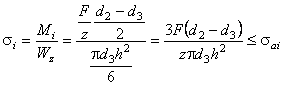 Calculul la incovoiere (fig. 2.34) se efectueaza pentru evitarea ruperii, la baza spirei, a filetului surubului sau piulitei. Spira se asimileaza cu o grinda incastrata cu sarcina in consola, sectiunea de rupere fiind suprafata exterioara a unui cilindru. Daca materialul piulitei este acelasi cu materialul surubului, se verifica numai spira surubului, aceasta avand sectiunea mai mica (diametrul sectiunii de rupere este mai mic), cu relatia