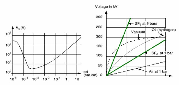 Curbele lui Paschen prezinta tensiunea de strapungere (īn KV) functie de distanta dintre electrozi si presiune, avānd trei zone de dependenta functie de produsul distanta electrozi si presiune: