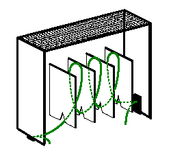 2 Extragerea caldurii din coloana arcului se face prin contactul acesteia cu peretii reci din camera de stingere( principiu denumit deion deoarece o mare cantitate de caldura din coloana arcului este absorbita de peretii reci ai camerei de stingere-deionizare). Arcul electric ce se formeaza īntre contacte este alungit sub actiunea fortei magnetice si deionizat prin contactul acesteia cu peretii reci din camera de stingere