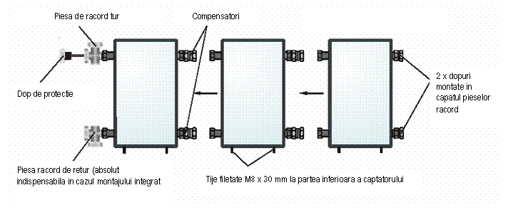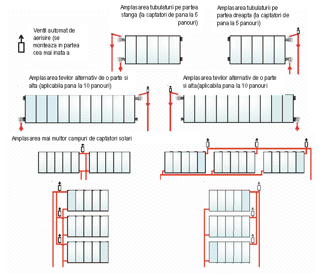 Un ansamblu de captatori, compus din pana la 5 panouri, poate fi montat cu pozitia tevilor unilaterala stanga sau dreapta, iar ansamblul de captatori, compus din pana la 10 panouri, poate 23423h714x fi montat alternativ de o parte si alta, ca in figura de mai jos.