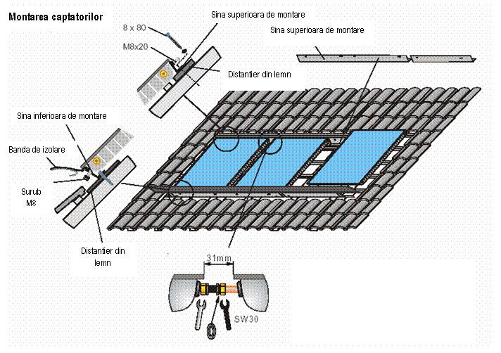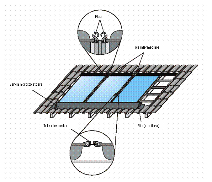 Din motive de securitate, este recomandabil ca suprafetele invecinate panourilor sa fie etansate cu carton bituminos sau materiale similare, pentru a nu permite infiltrarea apei intre captatori si acoperis.