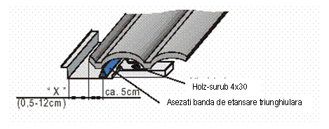 1. Dupa montarea prelungitoarelor, ajustati sina de montare in scopul obtinerii unei distante cuprinse intre 0,5 si 12 cm (cota "X") formata intre lungimea campului de captatori si terminalul acoperisului. In cazul in care aceasta cota nu este obtinuta, este necesara utilizarea unor pene de adaos. Cota "X" este foarte importanta intrucat ea garanteaza obtinerea uneii etansari totale la intemperii.