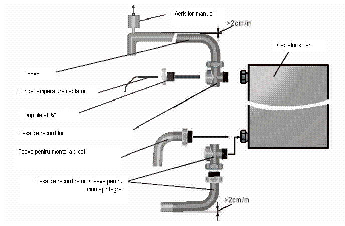 Inaltimea masurata pe verticala dintre partea superioara a captatorului solar si partea de jos a acestuia trebuie sa fie de cel putin grosimea a trei panouri, pentru a permite conductei de tur sa aiba o inclinatie ascendenta.