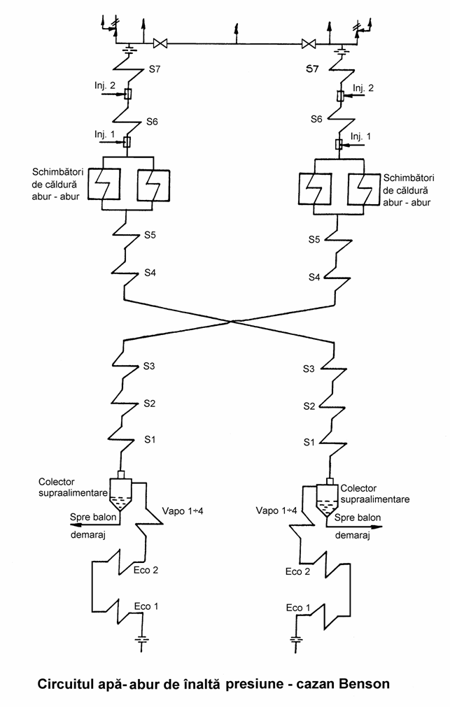 Din sistemul de vaporizare aburul trece, prin colectorii de supraalimentare, īn supraīncalzitorul 1 (S1), care este format din 2 pachete de serpentine orizontale de 2×124 tevi, cu diametrul 38×4 din 15Mo3.