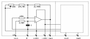Fiecare semnal de intrare este aplicat pe borna neinversoare a amplificatorului operational. Pentru depolarizarea semnalului de intrare (crearea zeroului real) se aplica o tensiune pozitiva pe intrarea inversoare si prin ajustarea valorii rezistentei reglabile se realizeaza zero real la iesire pentru zeroul fals al semnalului de intrare. De regula, semnalele de iesire vor fi în gama 0 5 V sau 0 10 V, fiind transmise modulului urmator pentru obtinerea functiei principale a aparatului.