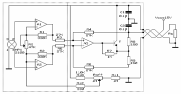 Circuitul este alimentat de la receptor cu o tensiune continua de 15 V. Senzorul se alimenteaza direct de la sursa de alimentare. Primul bloc este un amplificator diferential realizat cu A 1 si A 2. Conversia tensiune-curent se realizeaza cu un amplificator cu câstig unitar A 3 si tranzistorul T pentru amplificare în curent. Conectarea la primul bloc se face prin rezistentele R 3 si R 5. Pentru a asigura o buna rejectie de mod comun precum si liniaritatea circuitului este necesara sortarea rezistentelor R 3, R 4, R 5 si R 6 la aceeasi valoare. Pentru acelasi motiv este necesara si o buna împerechere a rezistentelor R 8 si R 9.