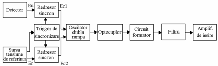 Schema bloc a adaptorului este reprezentata în figura 2.15. Schema primeste la intrare doua tensiuni: tensiunea utila, E u si o tensiune de referinta, E r destinata sa compenseze variatiile tensiunii de retea. Tensiunea de referinta se obtine printr-un transformator de la aceeasi sursa (retea) care alimenteaza detectorul. Prin circuite de defazare corespunzatoare este adusa în faza cu E u.