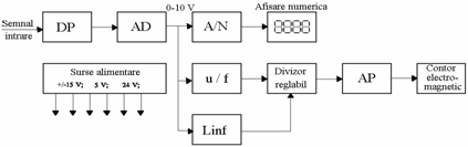 Schema bloc simplificata (figura 2.33.) include blocul surselor de alimentare, un element DP pentru depolarizarea semnalului de intrare, un amplificator diferential AD pentru aducerea semnalului amplificat în gama 0 10 V. Acest semnal este convertit printr-un convertor tensiune-frecventa în semnal în impulsuri cu o frecventa în gama 0 10 KHz. Divizarea acestei frecvente se face cu un coeficient reglabil necesar pentru modificarea vitezei maxime de integrare (numarul de unitati acumulate în contor într-o ora pentru un semnal de intrare 100 %), si care se fixeaza între 100 si 1000. Impulsurile de la iesirea divizorului sunt amplificate în putere si transmise la bobina contorului electromagnetic. Modulul contorului electromagnetic este prevazut cu un element pentru fixarea valorii limita inferioara L inf a semnalului contorizat. Daca semnalul de tensiune este mai mic decât valoarea limitei inferioare, elementul de limitare blocheaza numaratoarele ce alcatuiesc divizorul reglabil.