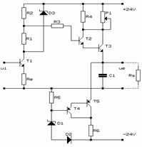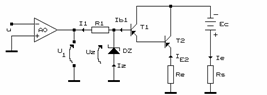 La cresterea curentului I e, scade U i, creste U BE a tranzistorului T 1 pâna când U BE > U g si T 1 se deschide. În acest caz se poate scrie: