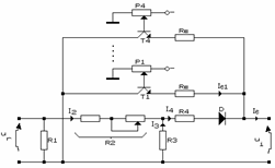 Tranzistoarele sunt astfel polarizate pe baza încât intra în conductie pe rând, pe masura ce creste curentul I e. Se modifica astfel configuratia circuitului de reactie astfel încât ecuatia lui reprezentata grafic se compune din cinci segmente cu pante din ce în ce mai mici. În cazul în care T 1 T 4 sunt blocate, se poate scrie: