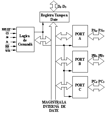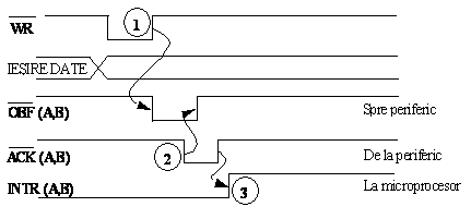 - INTRA, INTRB - cerere de īntrerupere spre microprocesor. Indica faptul ca datele au fost preluate de periferic. Este dezactivat de frontul crescator al lui WR .
