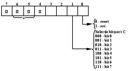 Īncarcarea cuvāntului de comanda cu bitul 7 egal cu 0 logic, permite comanda individuala a bitilor portului C, prin pozitionarea lor īn 1 sau 0. Bitii 6 - 4 nu sunt folositi si se pozitioneaza pe 0.