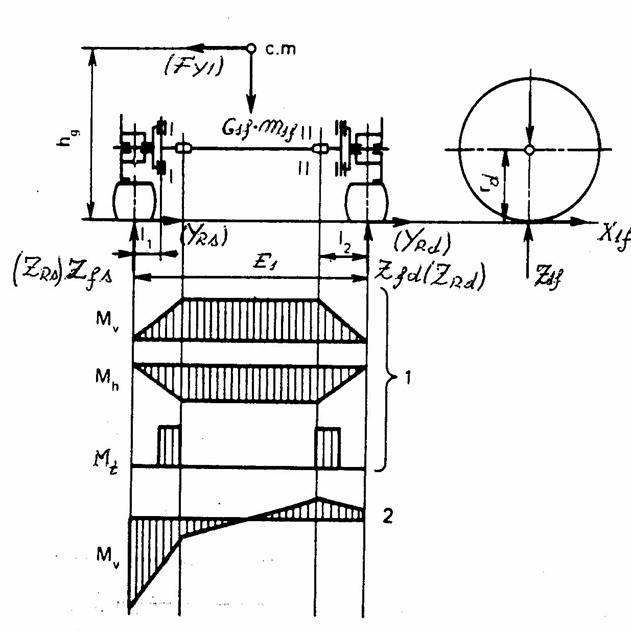 Fig.6.5.Modelul de calcul al puntii din fata rigide, inclusiv diagramele de eforturi: 1-regimul franarii; 2-regimul deraparii.
