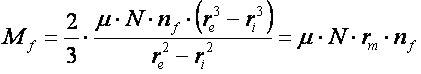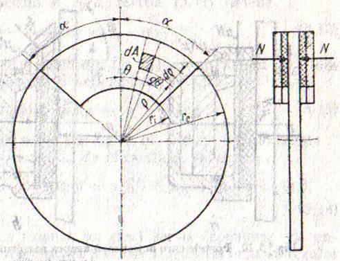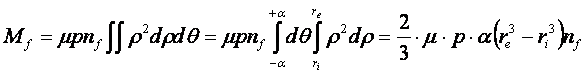 Forta normala pe elementul de arie dA=ρ·dρ·dθ este dN=p·dA, forta de frecare este dFf =μ·dN, momentul de frecare elementar in raport cu centrul O va fi dMf=ρ·dFf , iar momentul total de frecare pentru nf perechi de suprafete de frecare si distributie uniforma a presiunii va fi: