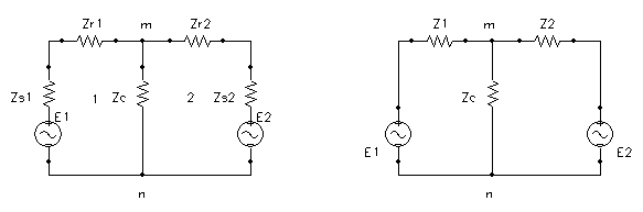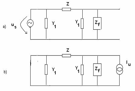 -o prima schema - conform figurii 1.18 a, în care apare sursa de trensiune si impedantele, sursa de curent nefiind reprezentata. Aceasta schema corespunde functionarii liniei în gol; la ea se poate adauga o impedanta corespunzatoare functionarii în gol a transformatorului - care a fost initial neglijata.