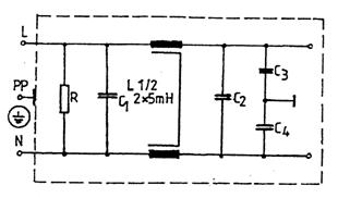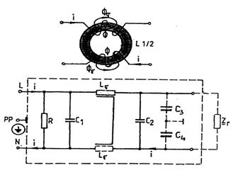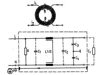 Din punct de vedere al schemei electrice, aceasta este concretizata printr-o sructura deosebita astfel încât filtrul sa fie eficient atât pentru semnalele de interferenta contratact (de mod diferential), cât si pentru semnalele de interferenta în acelasi tact (de pod comun). În fig.1.13 este prezentata schema electrica a filtrului care satisface aceasta cerinta si care include componente L si C. Dupa cum se va constata în paragrafele urmatoare, inductivitatea L 1/2 joaca un rol hotarâtor pentru satisfacerea conditiei de functionare pentru ambele tipuri de interferenta.