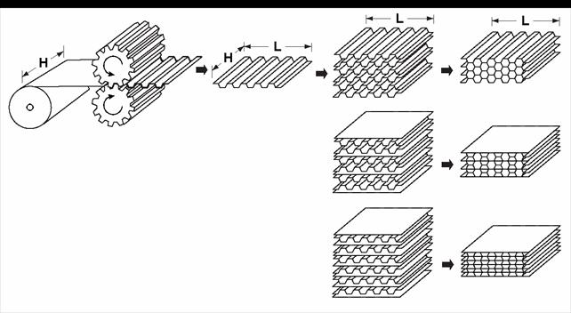 Fagurii sunt obtinuti pornind de la folii din aluminiu, procedeul fiind prezentat în figura 3. Se poate observa existenta mai multor variante de faguri.