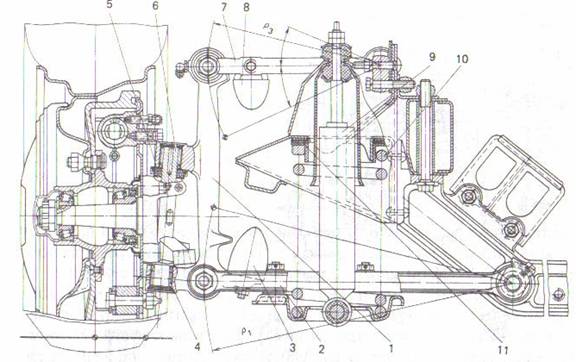In figura 1.8 este prezentata constructia sistemului de directie pentru o punte fractionata, cu mecanismul de actionare integrat in transmisia directiei (levierul de comanda cu arborele sau formeaza latura din stanga a patrulaterului central) si cu transmisia directiei cu patrulater central.