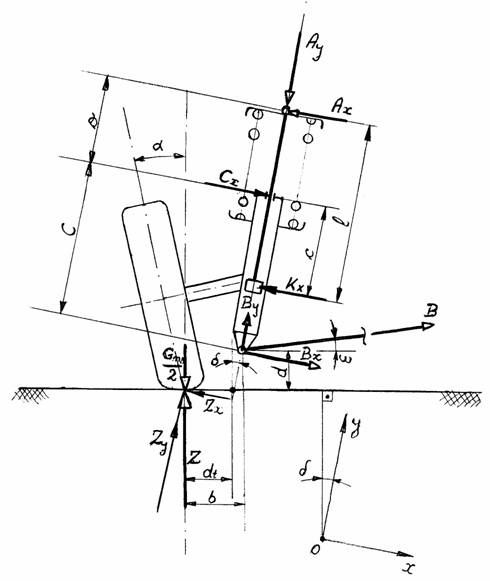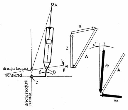 Reactiunea normala la roata Z da nastere unei forte B in bratul transversal si unei forte A in articulatia dintre tija amortizorului si caroserie, forte care sunt reprezentate prin componentele lor fata de sistemul de referinta ales, adica: Bx si By, respectiv Ax si Ay.
