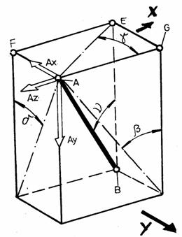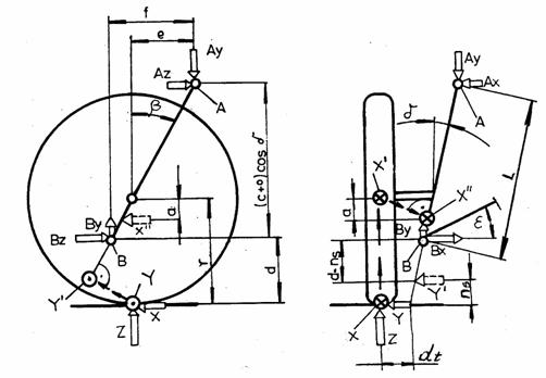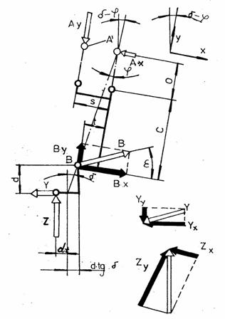 In cazul general, cand la contactul roata - cale actioneaza forte pe trei directii (normala Z, tangentiala X, transversala Y), iar axa de bracare are si unghi de fuga β, se foloseste modelul prezentat in figura 6.14 prntru determinarea fortelor din articulatiile A si B.