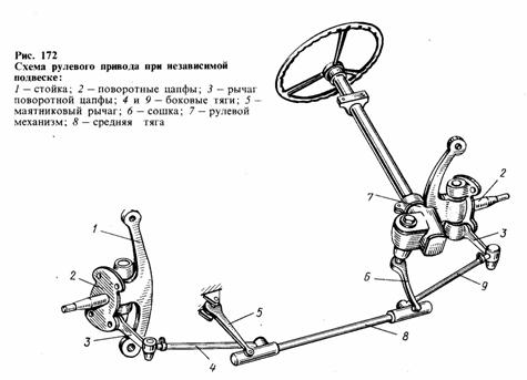 Fig.1.8.Constructia sistemului de directie cu mecanism de actionare cu melc si rola integrat si patrulater central: 1-portfuzeta; 2-fuzeta; 3-levierele fuzetelor; 4-bieleta dreapta; 5-levierul din dreapta al patrulaterului central; 6-levierul de comanda; 7-mecanismul de actionare; 8-bara transversala de directie (bara de conexiune); 9-bieleta din stanga.